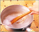 - 鍋に水2カップ、片栗粉、砂糖を入れて弱火にかけながら、全体が透き通ってぽってりするまで木ベらで練る。