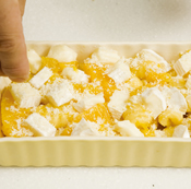 - グラタン皿に4を入れ、クリームチーズと粉チーズを散らしたら250℃のオーブンレンジで5分ほど焼き上げる。焼き色がついたらハチミツをかけ、セルフィーユを飾れば完成!